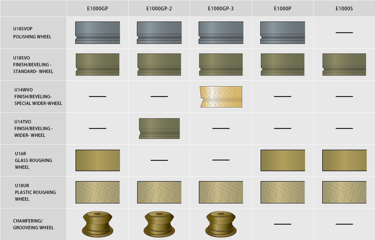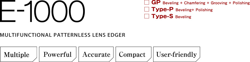 Please note that Mineral/Glass Edging is Not Available in E1000GP-2 / GP-3 type, by replacement with a 2nd 10 degrees Finishing wheel (wider Bevel wheel) that is optimized for High-minus and wrap lens.